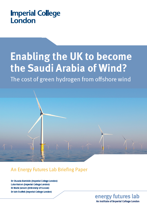This briefing paper, produced by researchers from the IDLES Programme at Imperial College London, explores the potential for producing green hydrogen from wind energy in the UK. It uses geospatial modelling to map the potential production cost of green hydrogen across the UK and its territorial waters. The key conclusions underscore the potential benefits of pairing offshore wind with hydrogen production.