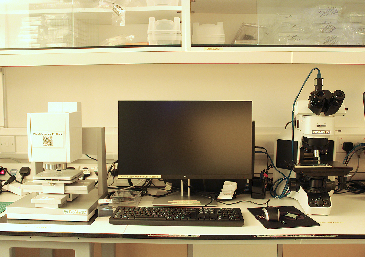 The CRUK Microfabrication Facility provides advanced tools for high-resolution surface characterisation, including a state-of-the-art optical profilometer and an Olympus bidirectional optical microscope equipped with dark-field imaging capability.
