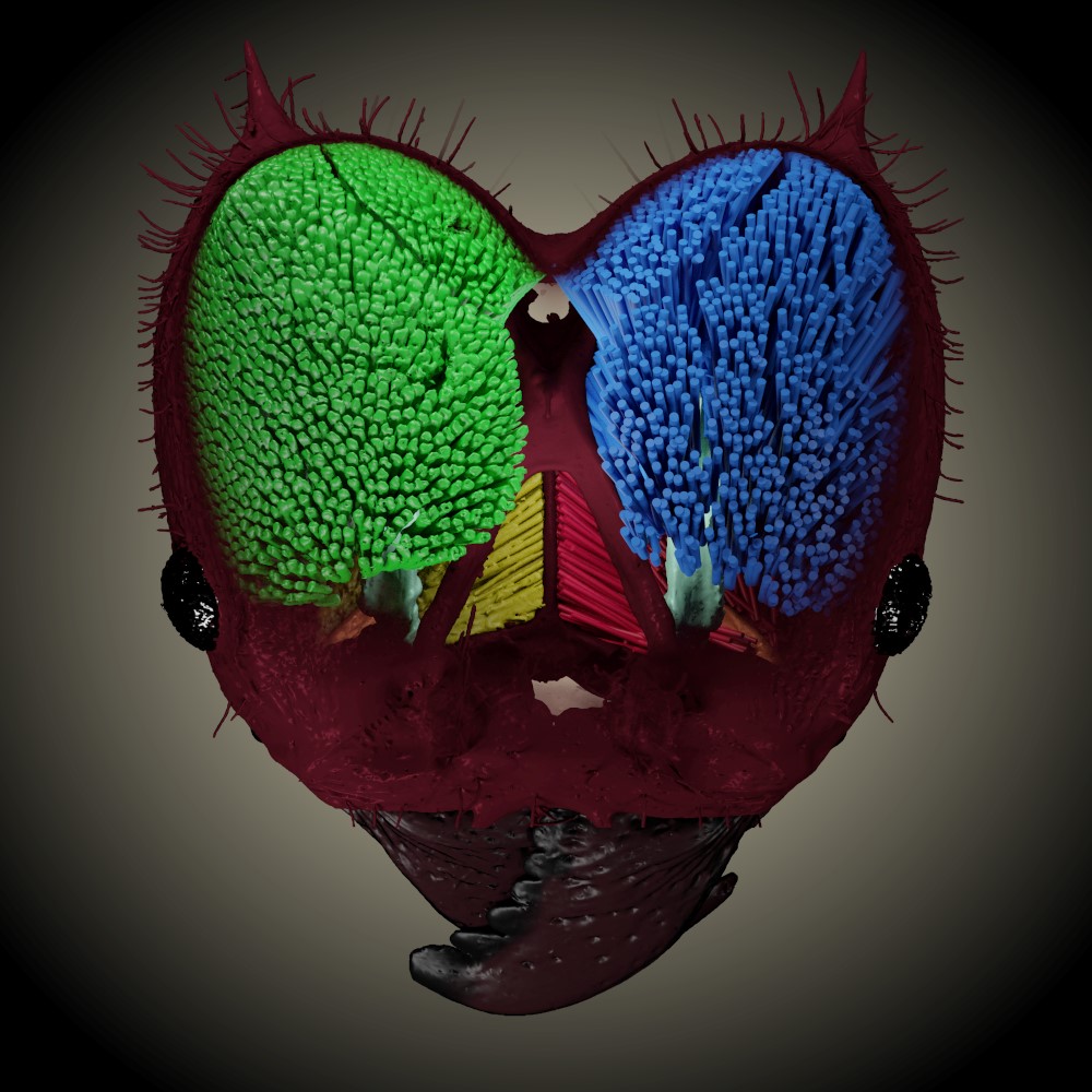 The Evolutionary Biomechanics Laboratory studies how physical constraints influence the performance, behaviour, and evolution of animals. A particular current focus of the group are the biomechanics of plant-feeding in insects - what are the mechanical adaptations that enable insects to forage and feed efficiently on plants, and what are the mechanical strategies plants can use to defend themselves? The image below shows a computed tomography scan of the head of a leaf-cutter ant worker (false colours). The head is almost completely filled with muscle (green and blue); as a result, leaf-cutter ants produce the highest size-specific bite forces recorded for any animal. This extreme specialisation is biologically necessary, for leaf-cutter ants are small animals that forage on tough plant leaves. Without it, they would be unable to cut the leaves. To understand this specialisation in more mechanical detail, we developed algorithms that allow us to reconstruct the original muscle tissue (green) digitally (blue), so providing detailed quantitative information about muscle 3D architecture.