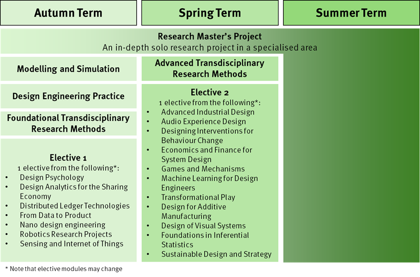 You will have the option of deepening your subject-specific knowledge with the selection of two elective modules which span a diverse set of topic areas, including Machine Learning for Design Engineers, Design for Additive Manufacturing, Design Psychology, Design Analytics for the Sharing Economy, Designing Interventions for Behaviour Change and others.