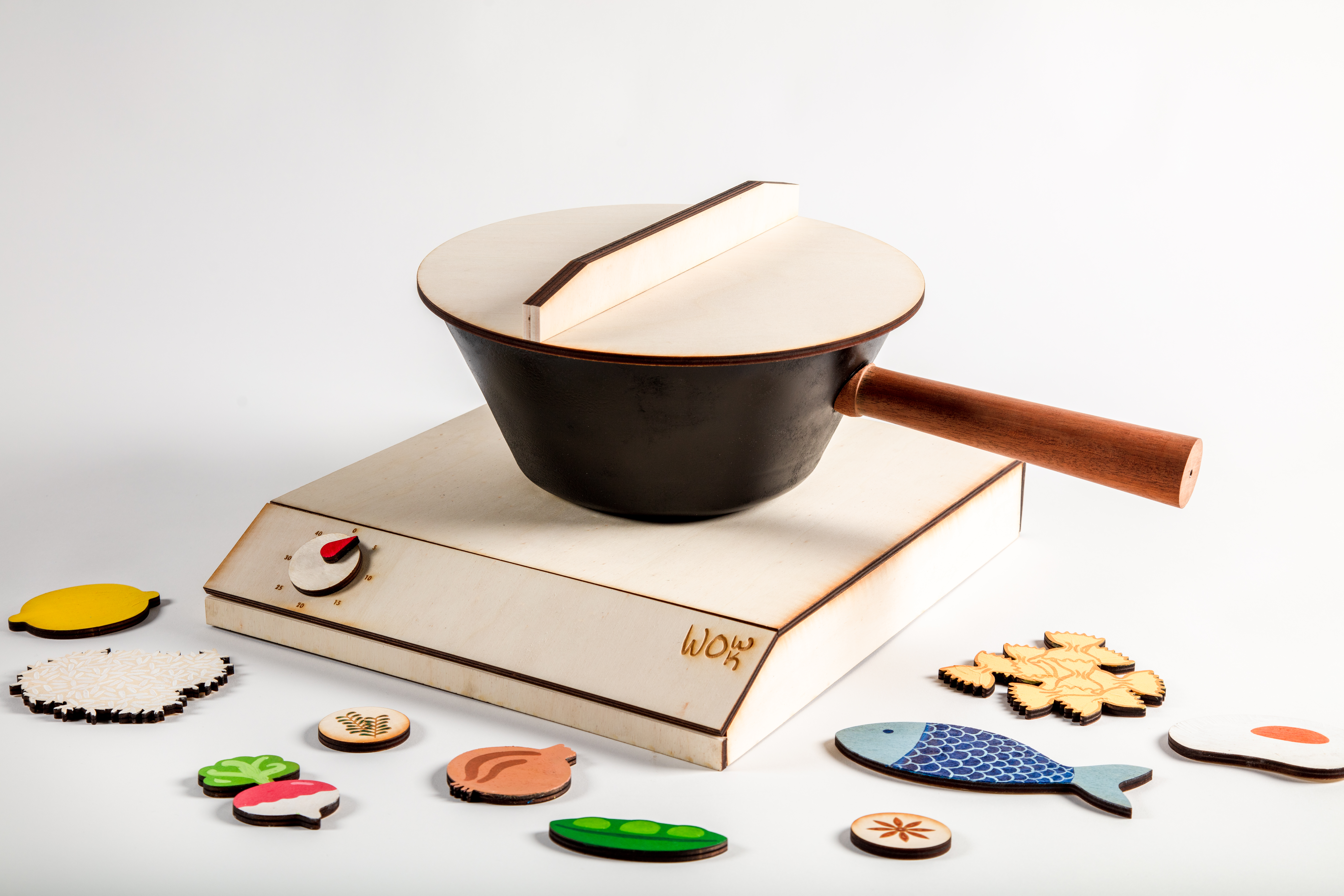 An interactive food exploration toy for young children. Wow wok facilitates the exploration of food by enabling children to role play cooking and encouraging them to experiment with different recipes and smells. Through exposing children to new smells, they are more likely to try new foods. This olfactory stimulation therefore tackles a rising challenge with childhood obesity and helps open up more food options in their diet, as well as improving physical health, mental health, cognition, moods and social behaviour.