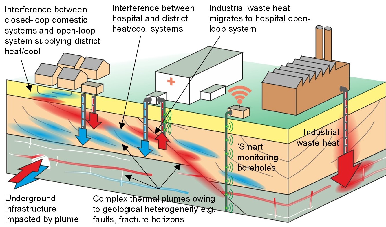The UK uses around 50 GW of energy to heat and cool buildings with only 6% from renewable sources. Widespread exploitation of urban geothermal resources could deliver a significant component and, in some cases, all of this energy demand, contributing to UK self-sufficiency and energy security. Geothermal resources offer natural heat energy, large-scale seasonal energy storage, cooling as well as heating, and a steady, low carbon energy supply. However, uptake is impeded by concerns over storage and production capacity, sustainability, scalability, environmental impact and resource management, especially in the case of adjacent multiple installations at city scale. The risks associated with these factors lead to higher costs which, along with a lack of visibility among stakeholders, leads to continued use of higher carbon alternatives.