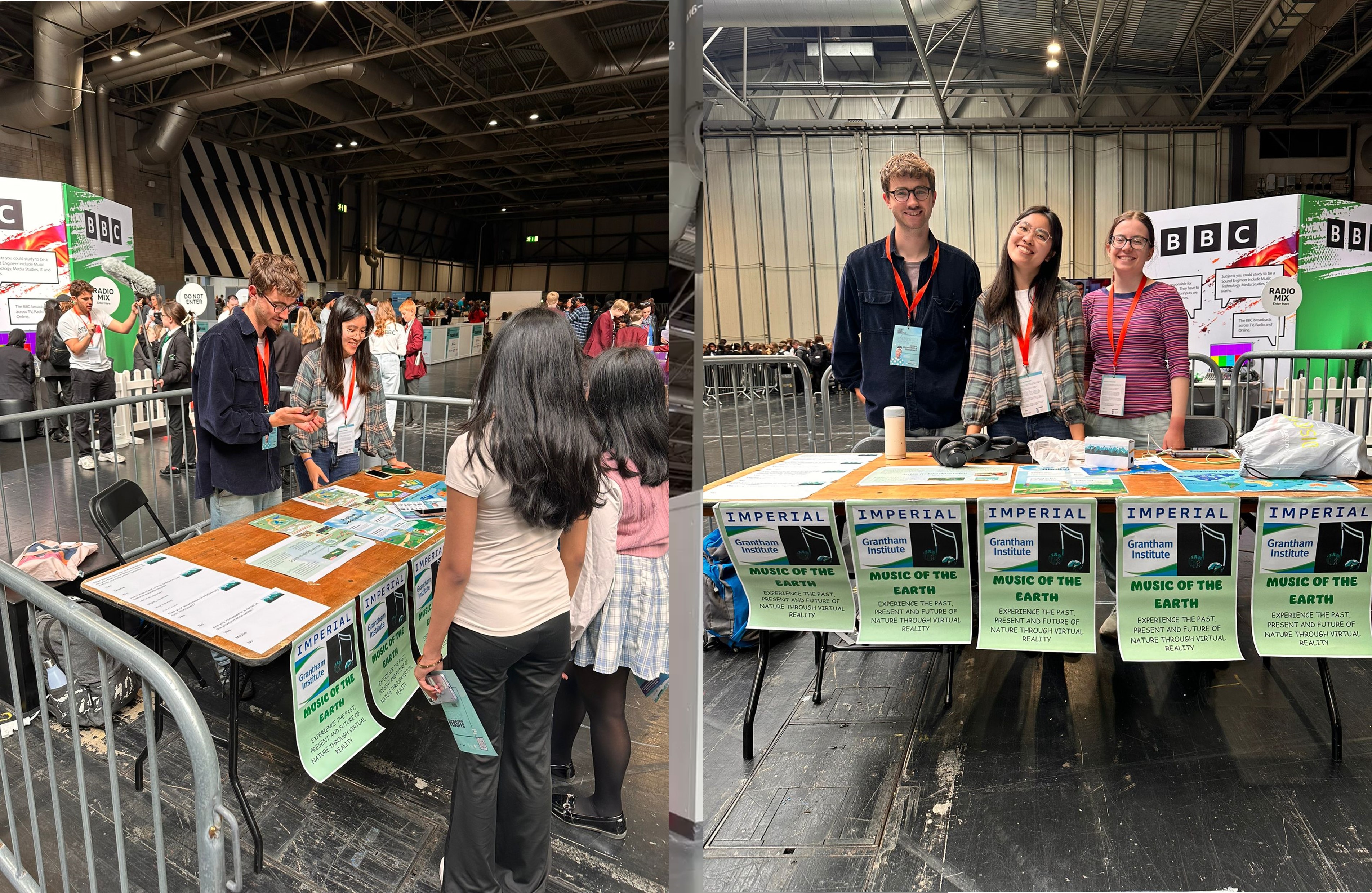 In June 24 we had a stall at the Big Bang Fair in Birmingham with VR headsets/headphones and extra activities. 20,700 young people from 352 schools visited, and we have been invited back for next year! In November 2024 we also had a stall at the Royal Institution for an event for 16-18 year-olds, co-hosted by the Grantham Institute and funded by NERC's 'Diversififying the Talent Pipeline' Initiative.
