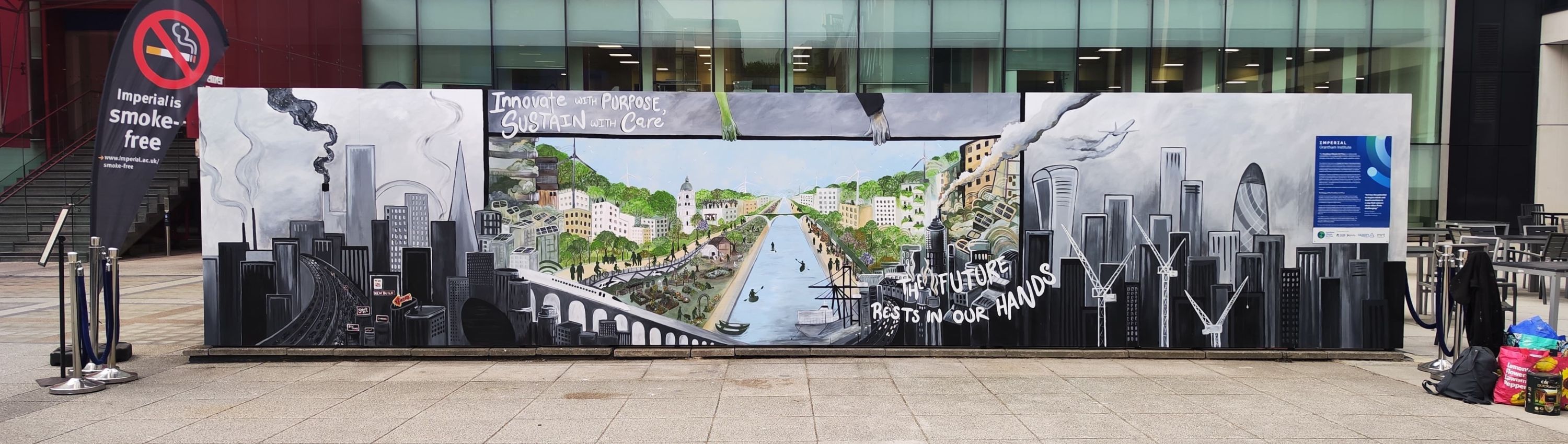 Design a mural showing a thriving, vibrant city full of nature and innovation for Imperial’s White City Campus