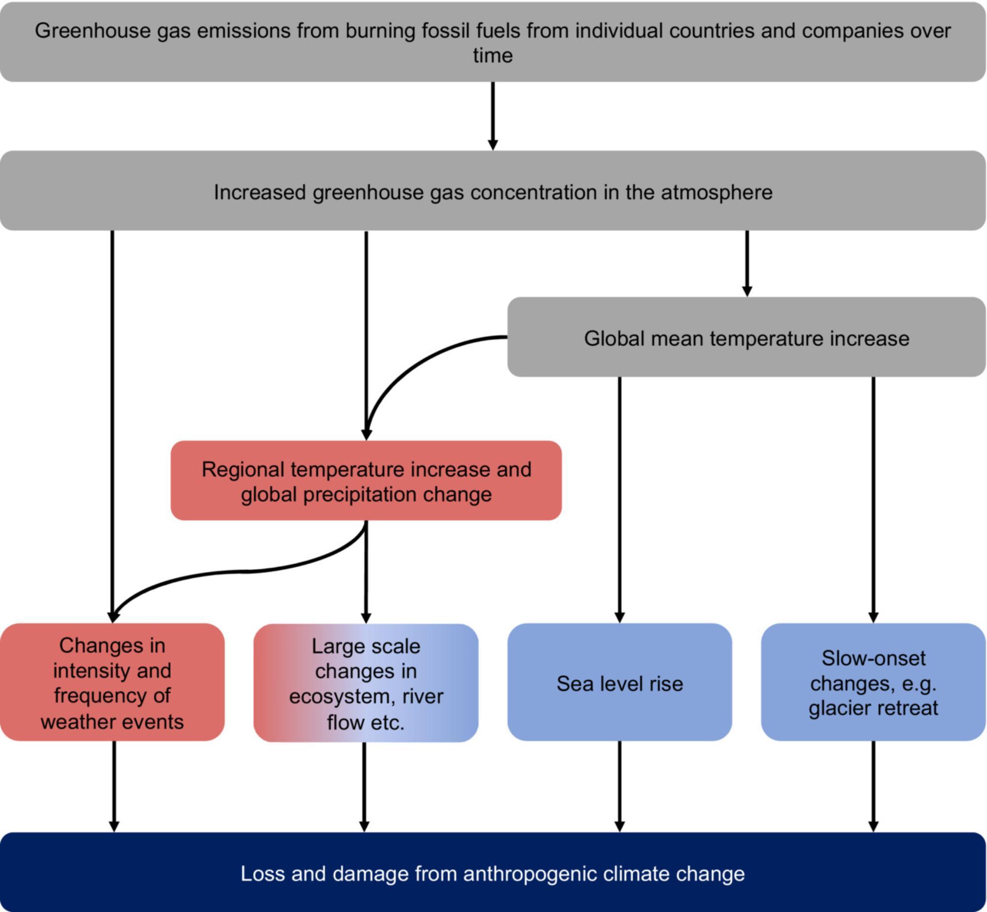 Figure 1: chain of causality of how greenhouse gas emissions cause loss and damage. Source: Otto, F. E. and Fabian, F., 2023. Equalising the evidence base for adaptation and loss and damages. Global Policy.
