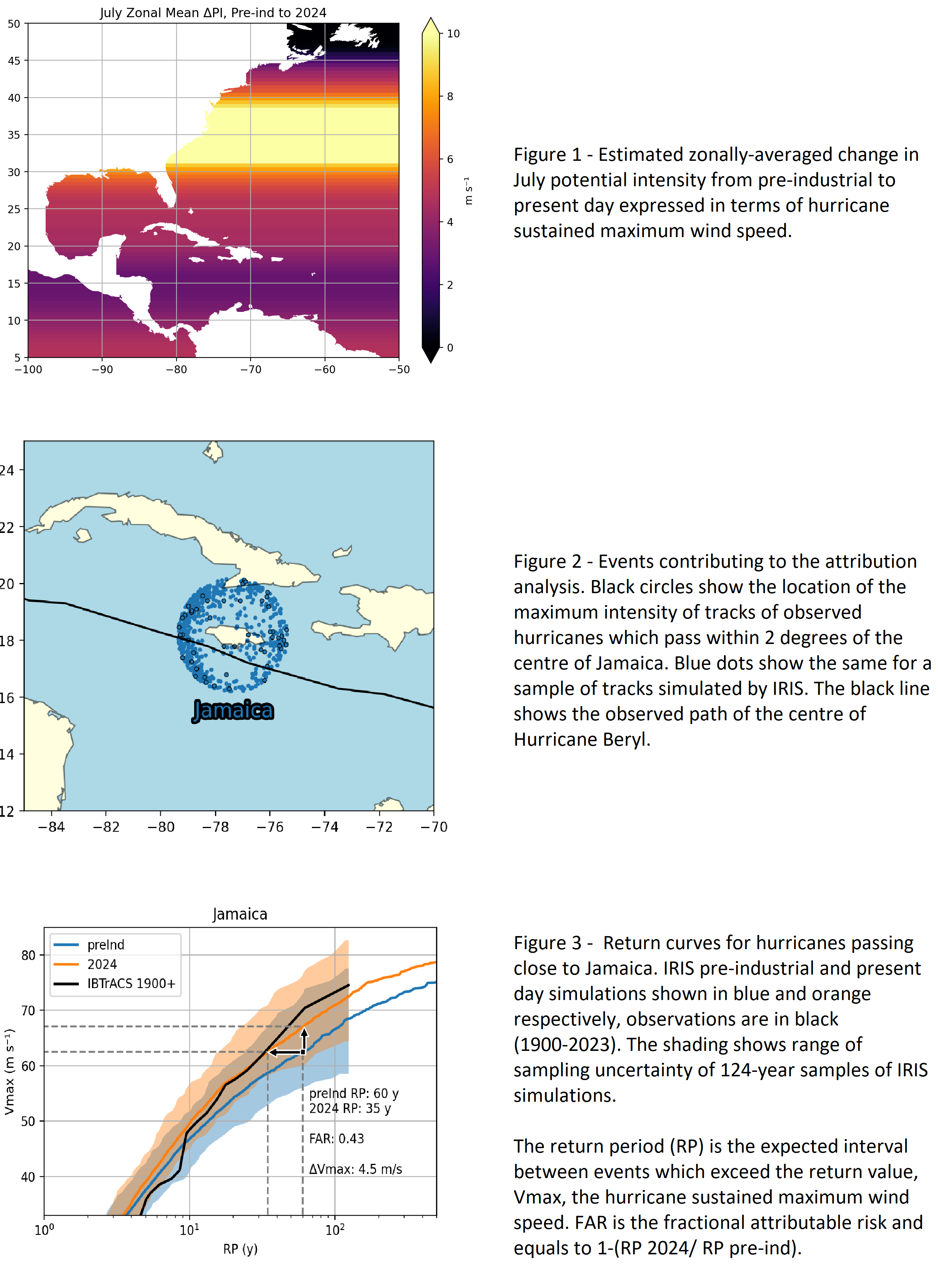 The intensity of a Beryl type event was increased by about 4.5 m/s or 7% (Figure 3) – a change from the middle to nearer the top of the Category 4. From this we can also determine that the likelihood of this type of event near Jamaica has changed from an event expected on average once every 60 years to once every 35 years (Figure 3).