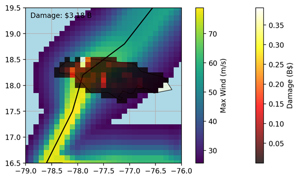 Figure 4 shows the wind footprint and the mean economic damages estimated. We then apply the landfall wind speeds for pre-industrial conditions and for a +2 °C global warming (see Figure 2). The pre-industrial and +2 °C simulations are for counterfactual scenarios assuming the current exposure and vulnerability and that only the wind speed is different. We find the wind speed increase makes substantially more damage. To communicate the effect of climate change on loss we define the fractional attributable loss, FAL: