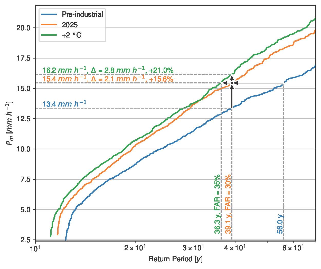 We also calculate the change of the hurricane eyewall rain rate as described by (Lau et al., 2025). The observed value of 15.4 mm/h is calculated as the maximum azimuthal mean rain rate at landfall from IMERG. Figure 3 shows the model return period of hurricane eyewall rain rate (maximum azimuthal mean) for Jamaica. We estimate that this type of event was about 43.3% more likely compared to pre-industrial times. The return period has decreased from 56.0 yrs to 39.1 yrs. For the same return period the current rain rate compared to pre-industrial events has increased by 2.1 mm/h or 15.6%. In a +2°C degree warmer world, the landfall eyewall rain rate increases by a further 0.7 mm/h, which amounts to a 21.0% increase compared to pre-industrial events. The FAR for “Melissa” type rain rate is 0.30. This means that at least 30% of the likelihood of this type of event can be attributed to climate change.