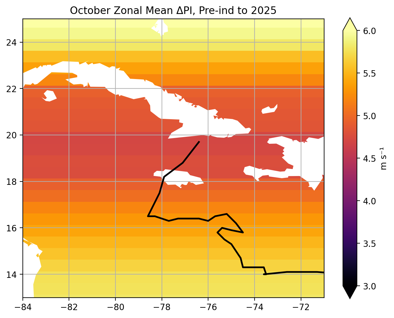 Figure 1 shows the zonal mean difference in October PI between 2025 and the pre-industrial estimate. The PI difference between 2025 and pre-industrial is about +5-6 m/s in the Caribbean. The frequency of landfall is the next consideration. The IRIS model calculates the intensity along the observed storm tracks for a 100,000-year simulation.