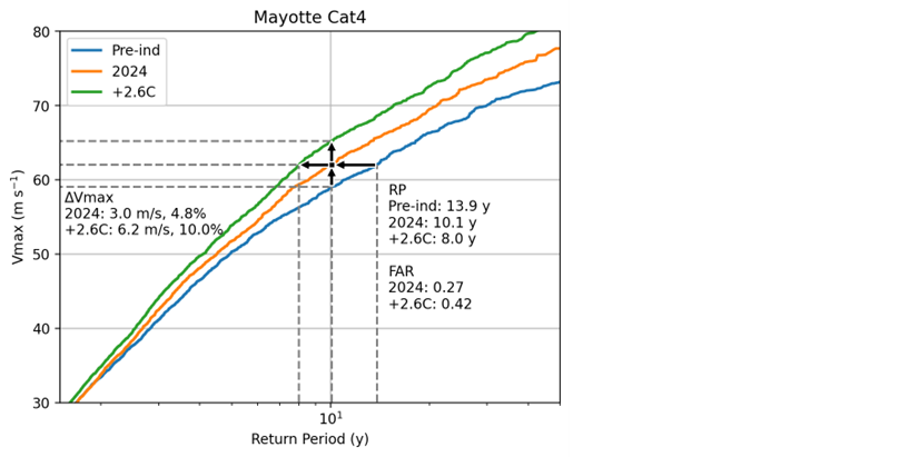 Figure 3. Shows the return period plot for wind speeds in the region near Mayottse’s landfall (1 degree radius) as observed and modelled. Landfall observations in the region are sparse over the 45 years used to build the IRIS model. However, the 1 degree radius region gives a reasonable sample for validation. In the case of Chido, a Category 4 at landfall, we estimate that this type of event was about 40% more likely compared to pre-industrial times. The return period has decreased from 14 yr to 10 yr. For the same return period the current wind speed compared to pre-industrial events has increased by 3 m/s or 5%. This change in wind speed is equivalent to an uplift from a Category 3 to Category 4. In a +2.6°C degree warmer world, the landfall wind speed increases by a further +3.2 m/s compared to the current climate (+1.3°C).