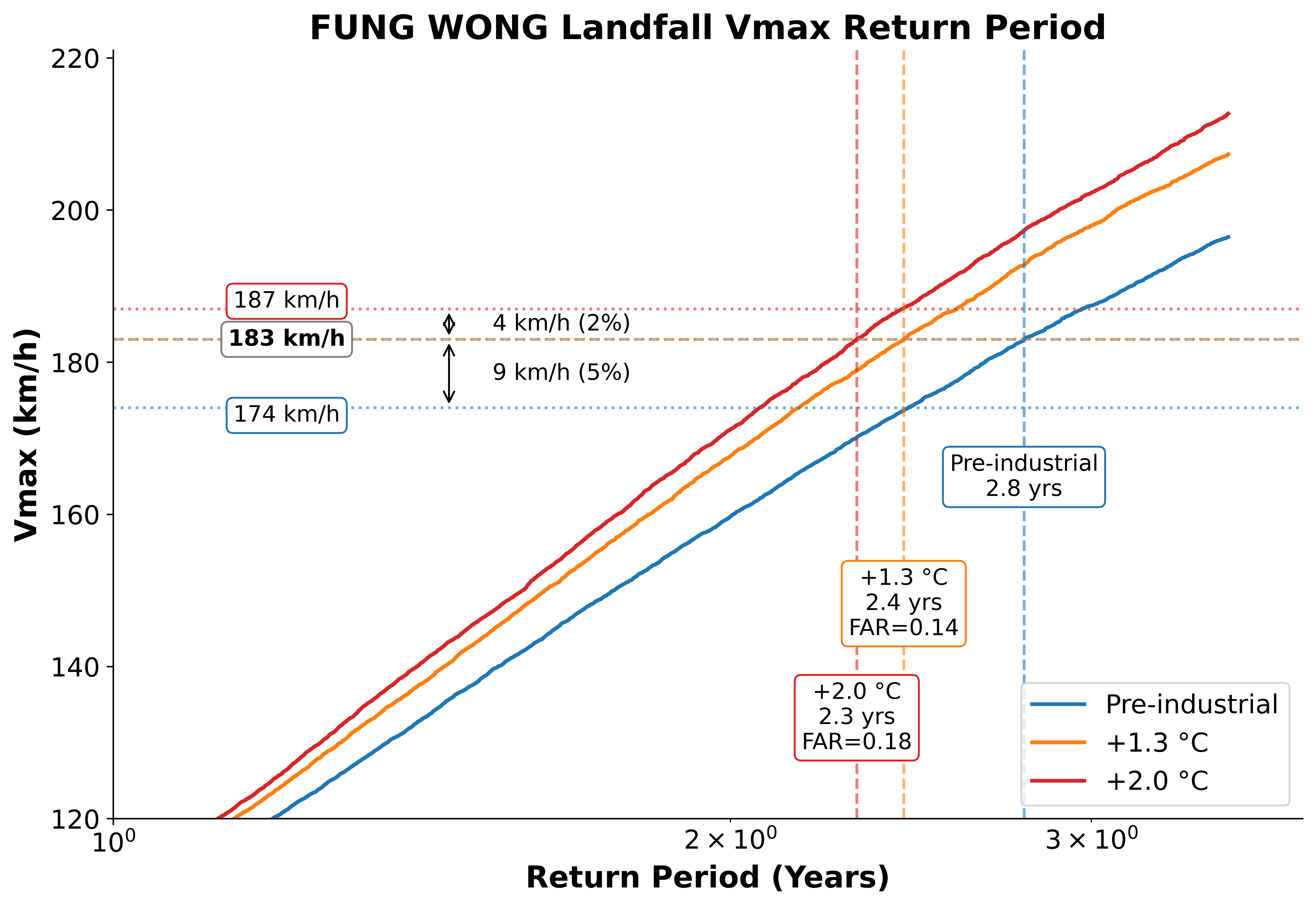 Figure 2 shows the model return period plot for typhoon landfall wind speeds in the Philippines. In the case of Fung-wong, a Category 3 at landfall, we estimate that this type of event was about 17% more likely compared to pre-industrial times. For the same return period, the current wind speed compared to pre-industrial events has increased by 9 km/h or 5 %. In a +2°C degree warmer world, the landfall wind speed increases by a further +4 km/h or +7% compared to a pre-industrial climate.