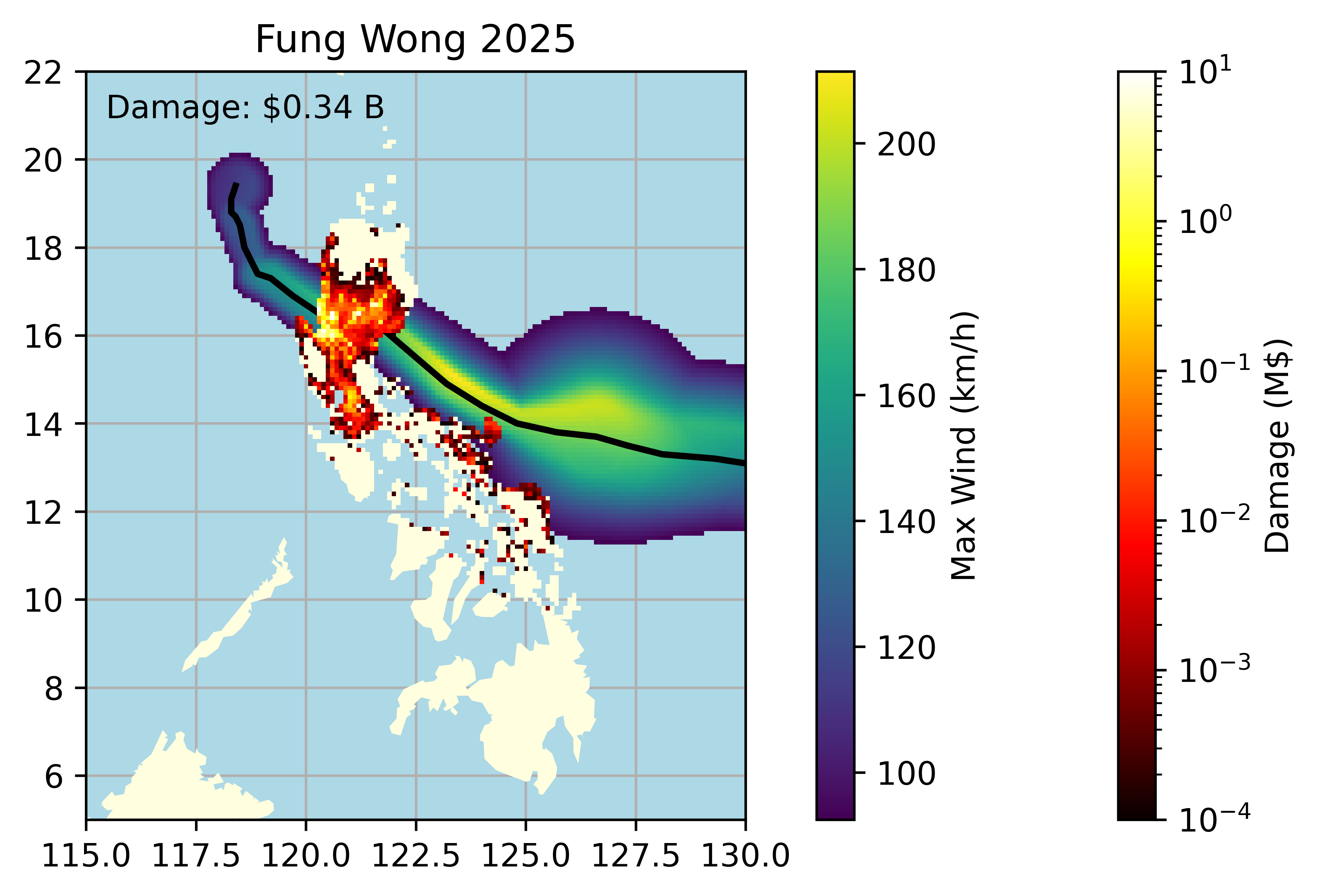 Typhoon Fung-wong was Category 4 with a reported life-time maximum wind speed of 213 km/h in the Philippine Sea. Fung-wong’s rainfall caused extensive damage in the Phillipines. Fung-wong was a Category 3 typhoon at landfall in the Philippines on the 9th of November 2025.