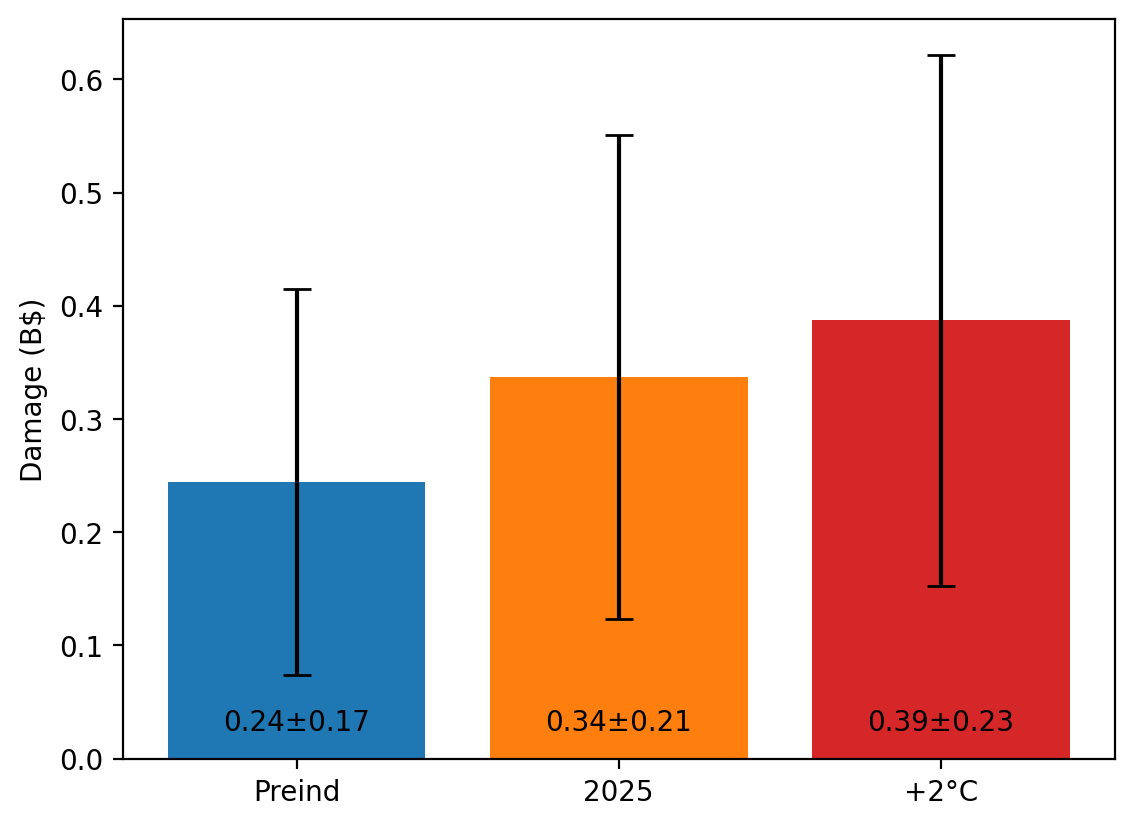 where L is the economic loss for the current (now) and pre-industrial climate (Pre-Ind). For the mean damage, we estimate the FAL is 0.29. This means about 30% of the economic damage can be attributed to climate change compared to the pre-industrial baseline. The damage was increased by +42%. In a +2°C degree warmer world the damage would increase by 63% compared to preindustrial as shown in Figure 5.