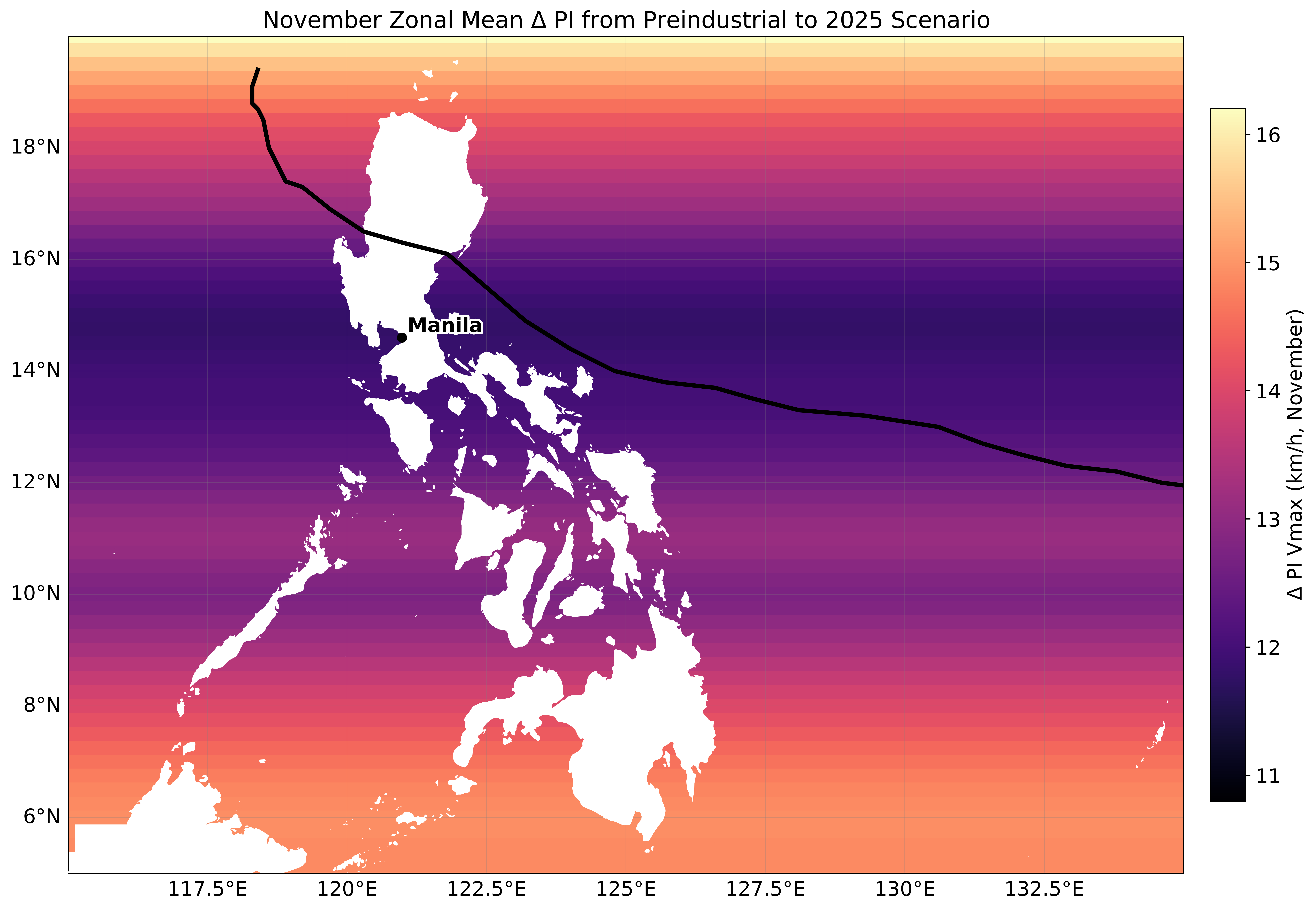 Figure 1 shows the zonal mean difference in November PI between 2025 and the pre-industrial estimate. The PI difference between 2025 and pre-industrial is about + 13 km/h in the Philippine Sea. The frequency of landfall is the next consideration. The IRIS model calculates the intensity along the observed storm tracks for a 10,000 year simulation.