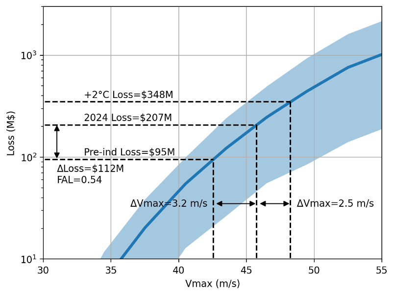 Figure 4. Economic damage (2024 M$US) vs maximum wind speed at landfall calculated along the track of Shanshan. Dashed lines show the pre-industrial, current and + 2°C scenario. Change of wind speed is +3.2 m/s from pre-industrial to current and a further +2.5 m/s from current to +2°C. FAL is the fractional attributable loss for the intensification due to climate change to date (Equation 2). Line shows the mean and shading shows the 10%-90% percentile range.