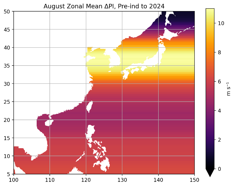 Figure 1. Zonal mean potential intensity, PI, difference for August between now (“2024”) and pre-industrial.