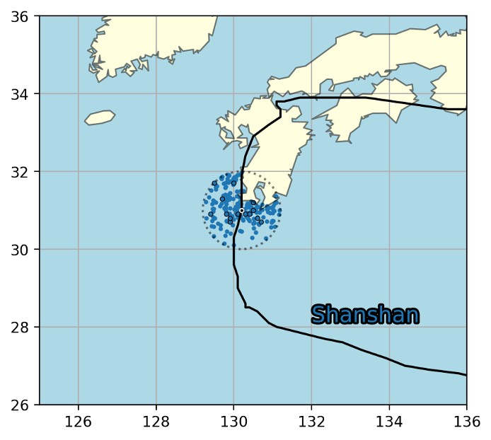 Figure 2. Simulated and observed event locations in the vicinity (1 degree radius) of Shanshan landfall.