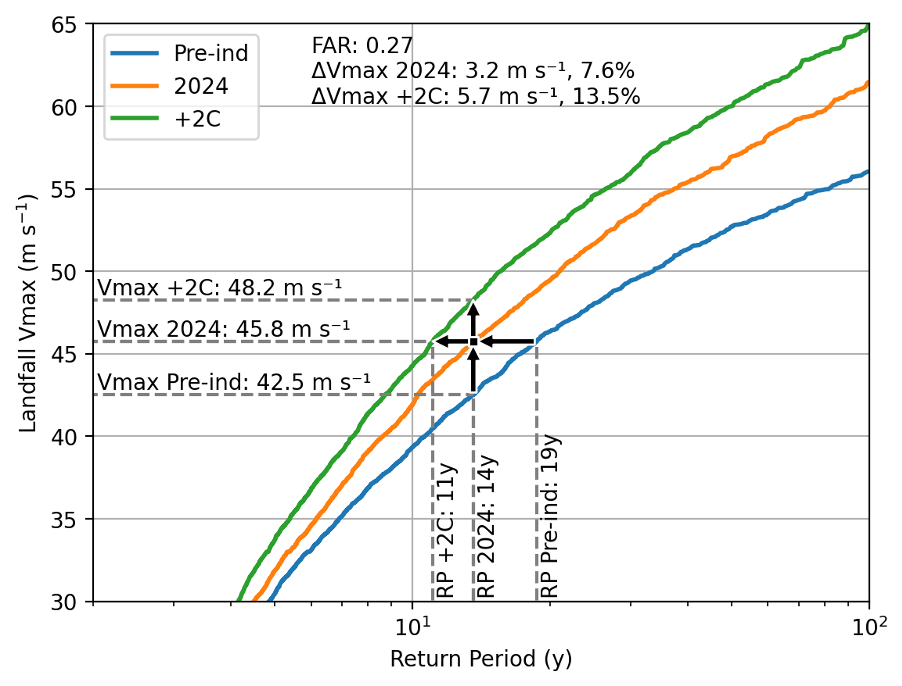 Figure 3. Landfall wind speed vs return period for the vicinity (1 degree radius) of Shanshan landfall as calculated for the current climate “2024” (orange line), pre-industrial (blue line). FAR is the Fractional Attributable Risk (Equation 1) of landfall with a maximum wind speed of 46 m/s in the 2024 scenario ΔVmax is the change in Vmax from the pre-industrial scenario.