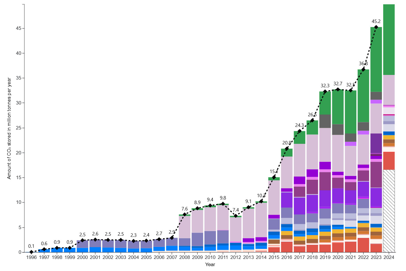 The Register’s 2025 Annual Report tracked the annual rates of CO₂ stored underground from operational projects worldwide from 1996 to 2024. It compiled public information (such as government databases on greenhouse gas reporting) and surveyed project operators in a co-ordinated effort to establish the first and most comprehensive record of CCS growth and maturation to date.