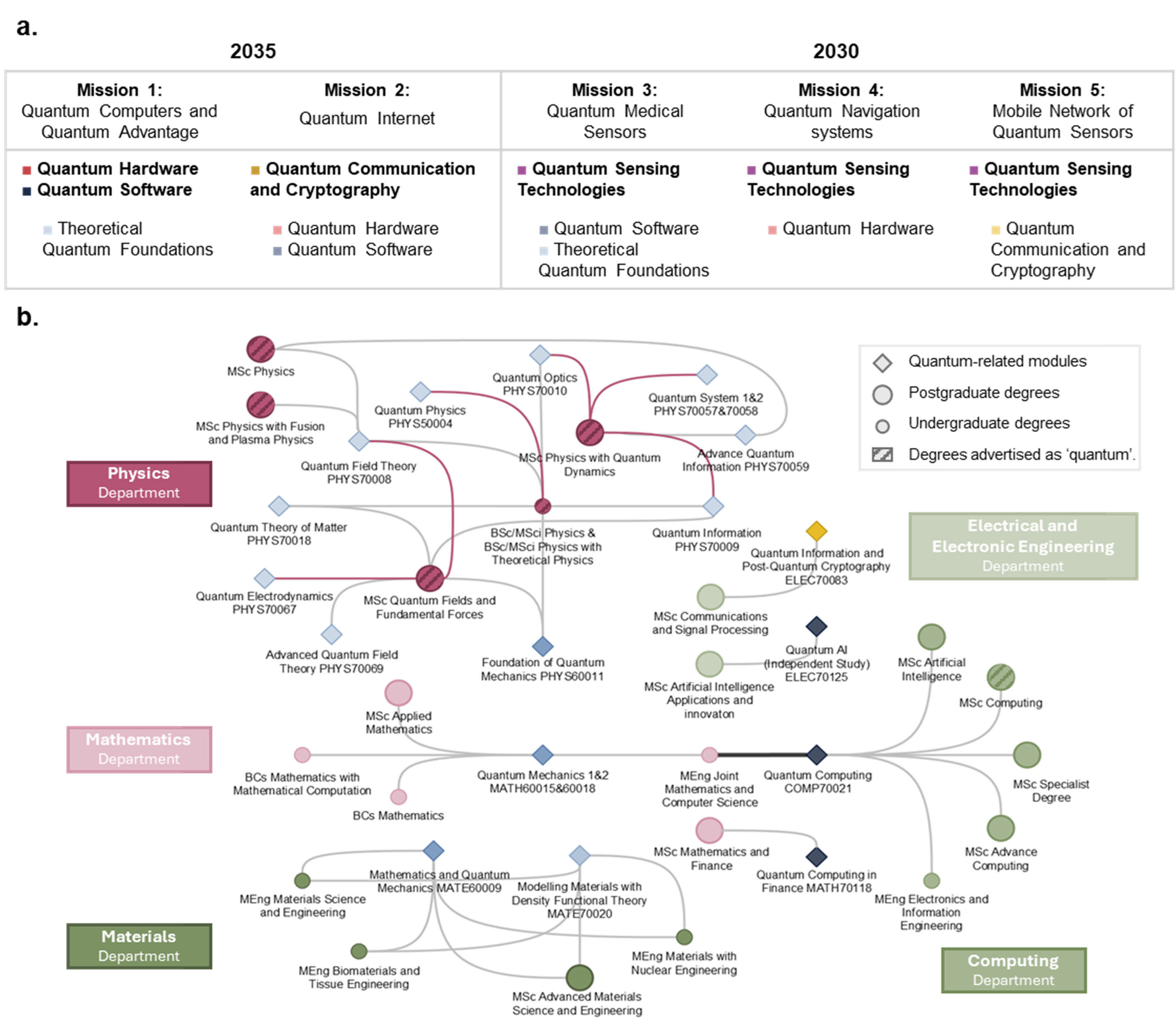 Fig1. a) Summary of national quantum missions and the main and secondary quantum skills they require. b) Network of quantum-related modules taught at Imperial and their links to undergraduate and postgraduate degrees. Modules colours correspond to the skill categories in panel a. Links are light grey for elective modules, coloured for core modules, and dark grey for modules shared between departments.