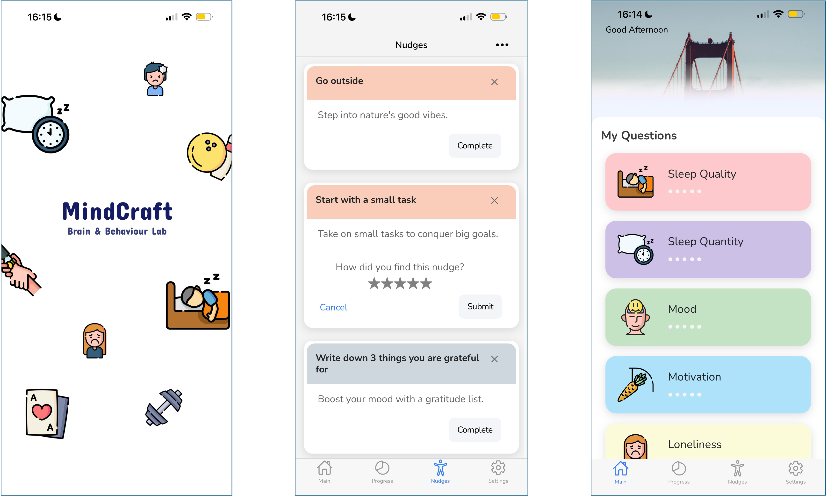 Screenshots of the MindCraft app: