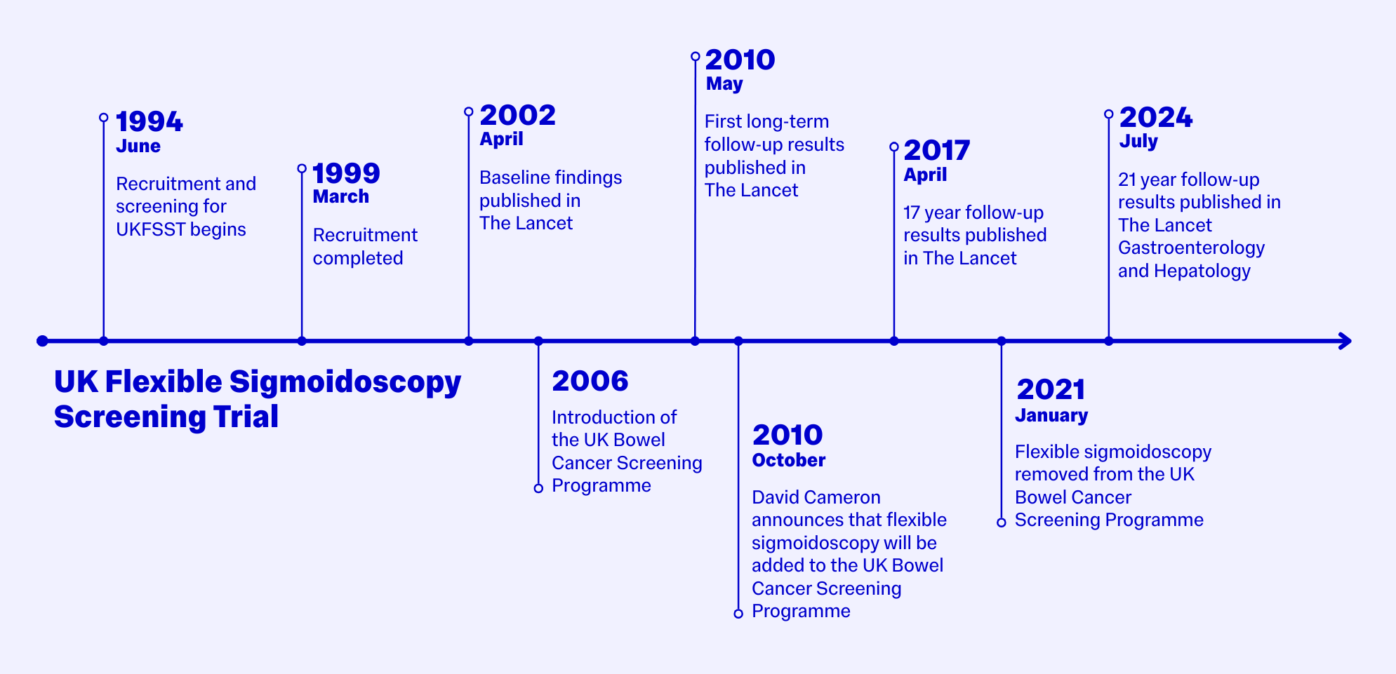 Wooldrage K*, Robbins EC, Duffy SW, Cross AJ. Long-term effects of once-only flexible sigmoidoscopy screening on colorectal cancer incidence and mortality: 21-year follow-up of the UK Flexible Sigmoidoscopy Screening randomised controlled trial. Lancet Gastroenterol Hepatol. 2024; 9: 811–24. DOI: 10.1016/S2468-1253(24)00190-0.