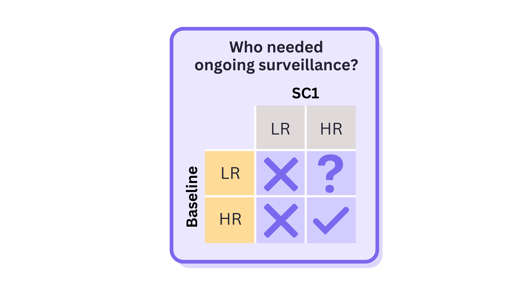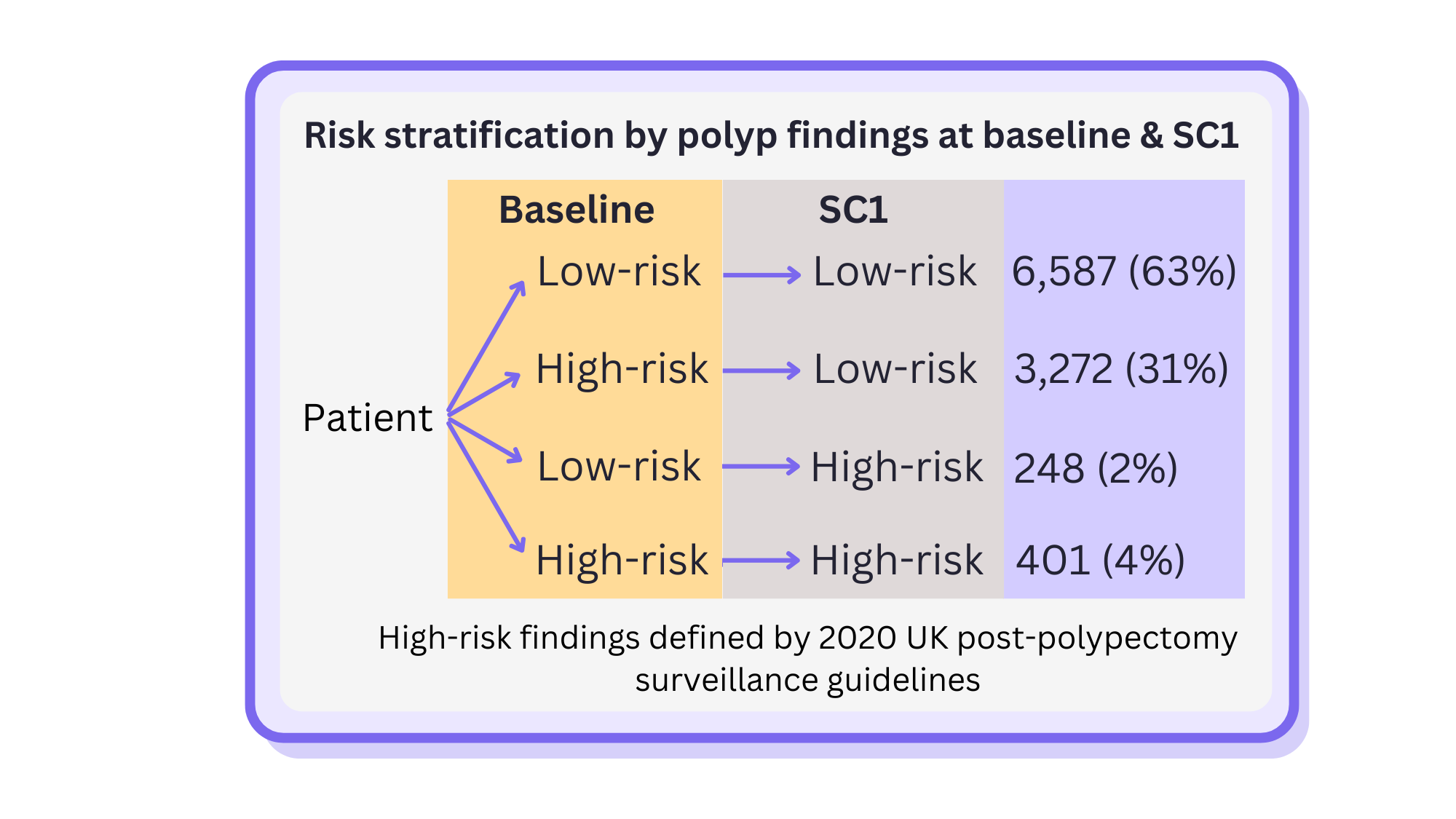 Our new analysis aimed to provide evidence for which patients need ongoing surveillance by identifying those who remain at higher risk of bowel cancer after their SC1, compared with the general population. We included 10,508 patients who had polyps removed at an initial colonoscopy (‘baseline’) and who attended an SC1. We followed them for an average of 8 years after SC1 to determine which patients developed bowel cancer. The patients were split into four groups depending on whether the polyps at their baseline colonoscopy and SC1 were considered low-risk (LR) or high-risk (HR), according to the 2020 UK post-polypectomy surveillance guidelines. The number of new bowel cancer cases in each group was then compared with the number expected in the general population.