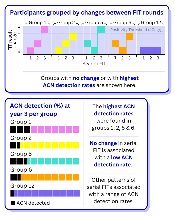 The outcomes measured at colonoscopy were the detection of advanced adenomas or colorectal cancer (jointly termed advanced colorectal neoplasia or ACN). By analysing the trends in the blood found in participants’ stool over three annual rounds of FIT, we aimed to determine whether serial FIT testing could predict which participants were at a lower risk of ACN.