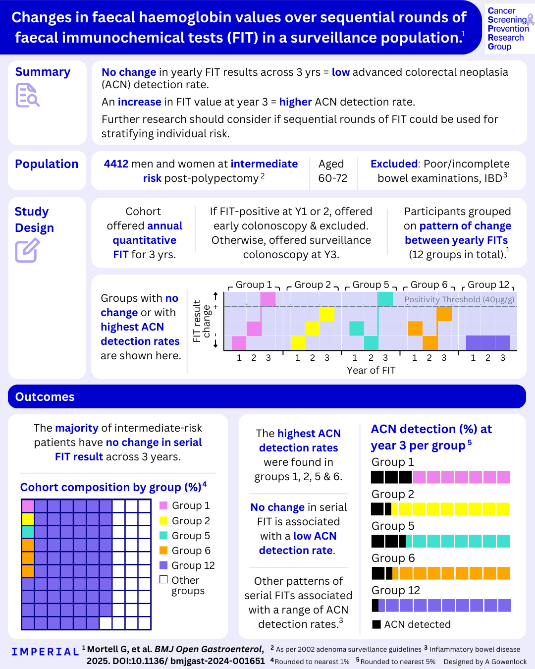 For some patients with a history of pre-cancerous bowel polyp, regular surveillance by colonoscopy is crucial to protect them against cancer development, but the increased demand for these procedures is placing significant strain on NHS endoscopy services. This new analysis, which used data from our FIT for Follow-Up study, investigates whether serial faecal immunochemical tests (FIT) could offer an alternative approach to colorectal cancer surveillance, potentially reducing reliance on colonoscopies while maintaining patient safety.