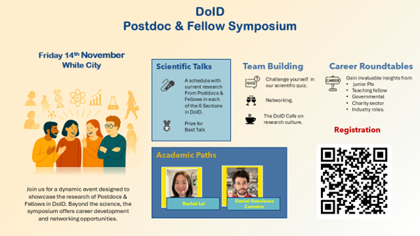 On Friday 14th November at White City, we held our DoID Postdoc & Fellow Symposium. There were research talks from postdocs and fellows, and perspectives on career progression from Wendy Barclay, Rachel Lai and Daniel Gonçalves Carneiro. We also had career roundtables, a team quiz, and networking.