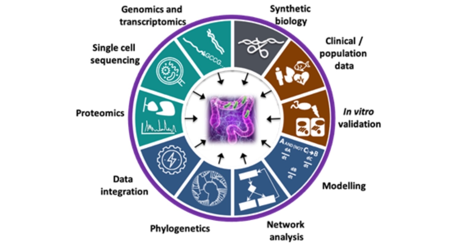 In healthy individuals, the gastrointestinal tract relies on highly sophisticated intercellular interactions to sense, adapt and respond appropriately to its cells’ immediate and distant environments. These include not only external factors (e.g. diet, resident, transitory probiotic or infectious microbes) but also other host cells from near or far distances (e.g. the underlying mesenchyme, the gut-associated innate and adaptive immune cells, the enteric nervous system, or even distant organs like the liver, the lung or the brain). Dysbiosis of the microbiota or any alteration of host cell-to-cell crosstalk can result in complex multifactorial pathologies, including Inflammatory Bowel Disease (IBD). We are combining in silico systems biology approaches with experimental data generation and validation using the human colon organoid model (colonoids). Organoids are 3D structures, grown from stem cells that recapitulate the normal physiology and the different cell types of the original organ. Intestinal organoids enable the in vitro study of the regulation/dysregulation of epithelial homeostatic functions, cell-to-cell interactions and host-microbiome interactions happening in the gut during health and disease. Furthermore, the generation of multi-omics data from organoids, in combination with the application of in silico network tools, such as our OmniPath database, enables the generation of molecular interaction networks allowing contextual and multiscale analysis of the ‘omics data. These approaches facilitate deciphering molecular mechanisms involved in gut homeostasis. By increasing the understanding of the underlying factors altered in intestinal dysbiosis-associated pathologies and the beneficial effects commensal bacteria may have on intestinal cell function, we hope to pave the way for translational developments in the prevention and treatment of gastrointestinal disorders.