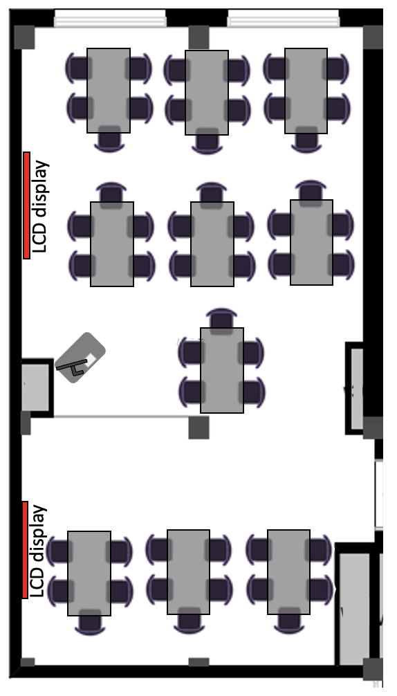 - Room facilities: PC, 8x medium-sized screens, 8x tables with 6x chairs