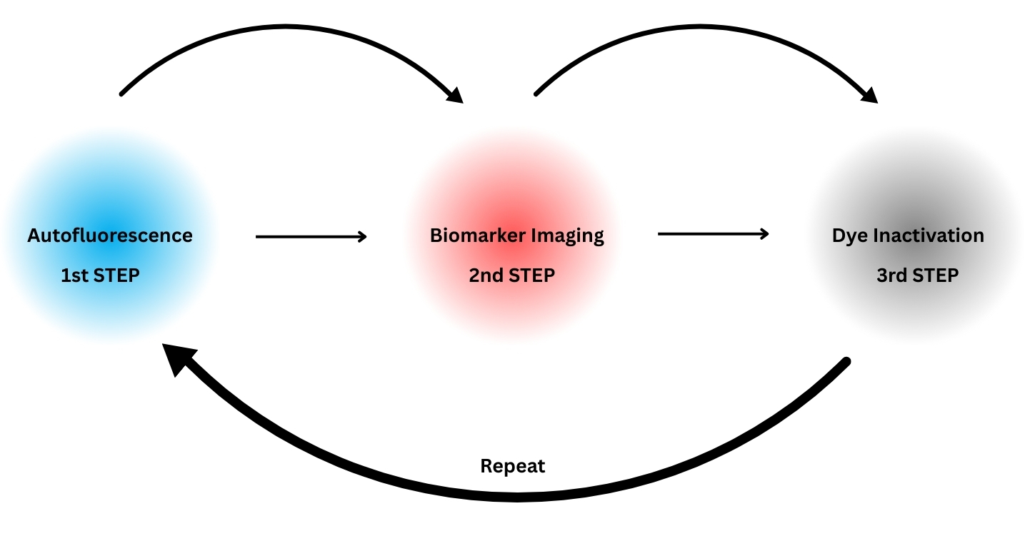- Labels and images 4 targets at a time, multiplexing is achieved via multiple rounds of labelling and imaging.
