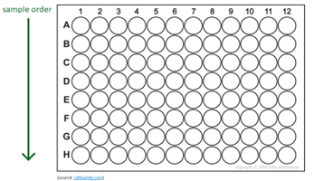 The samples should be aliquoted vertically; A1 to H1 then A2 to H2, etc, with no gaps between the samples.