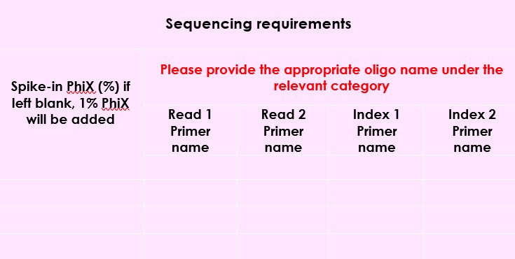 Any misinformation regarding index sequences will invariably cause delay in data being created therefore it is vital that the submission form is filled in correctly and accurately.