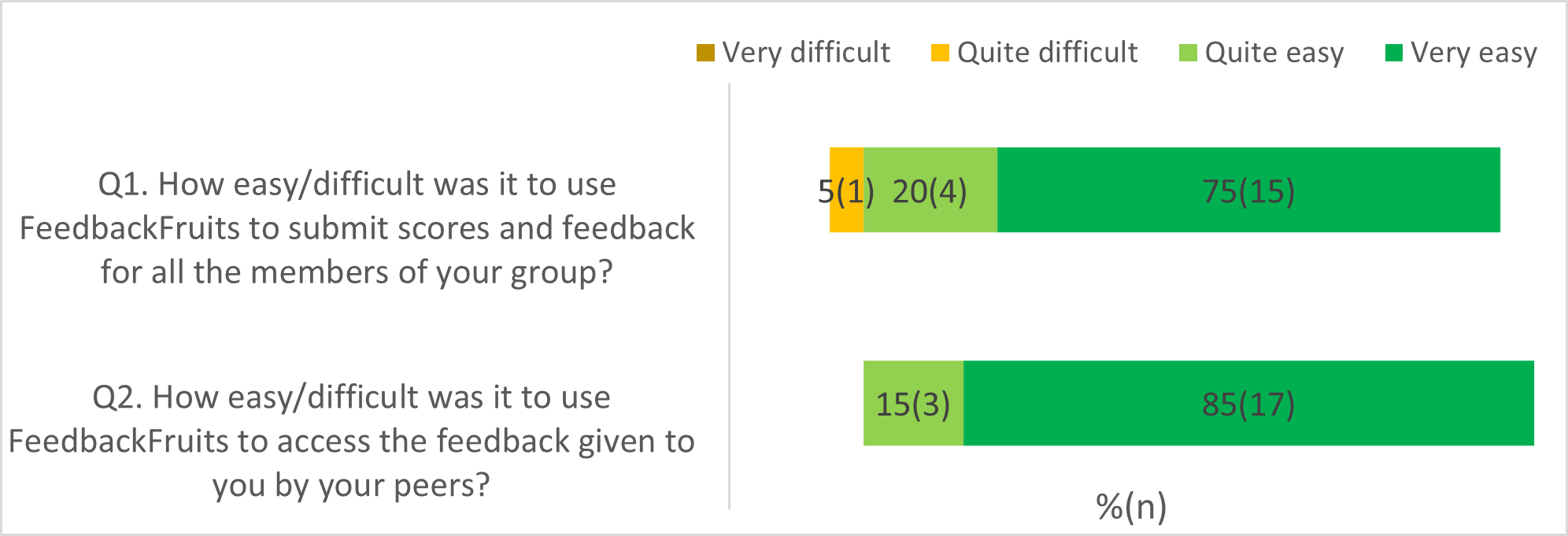 - The majority (19) reported finding easy to use FeedbackFruits to submit scores and feedback comments about the contribution of their peers to the TBL groupwork. One student found it quite difficult.