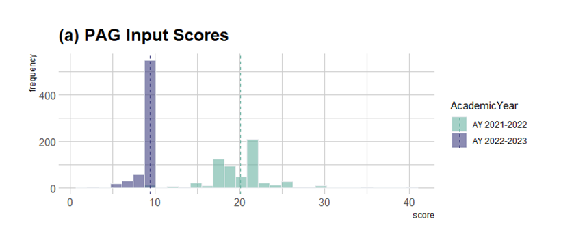 The impact of the scoring design used in FeedbackFruits on the TBL overall marks was investigated by comparing the mark distributions for AY 2021-2022 and AY 2022-2023. Figure 3 shows the distributions of TBL overall marks for the two academic years and Table 4 shows the summary statistics.