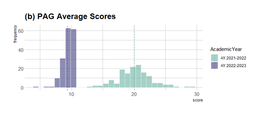 There was a higher mean and slightly narrower spread of TBL overall marks in AY 2022-2023 compared with the previous year, as indicated by a reduction in the range and standard deviation. An unpaired, two-tailed t-test for samples with unequal variance revealed a significant difference between the distributions of TBL overall marks for these years (p<0.001). However, this could not be attributed solely to differences in peer assessment marks because there was also a higher mean and a significant difference between the weighted sum of marks for the other components of the TBL exercise (AY 2021-22 mean = 62.6, AY 2022-2023 mean = 67.5; p<0.001).
