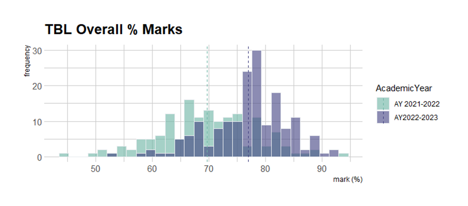The impact of the scoring design used in FeedbackFruits on the TBL overall marks was investigated by comparing the mark distributions for AY 2021-2022 and AY 2022-2023. Figure 3 shows the distributions of TBL overall marks for the two academic years and Table 4 shows the summary statistics.