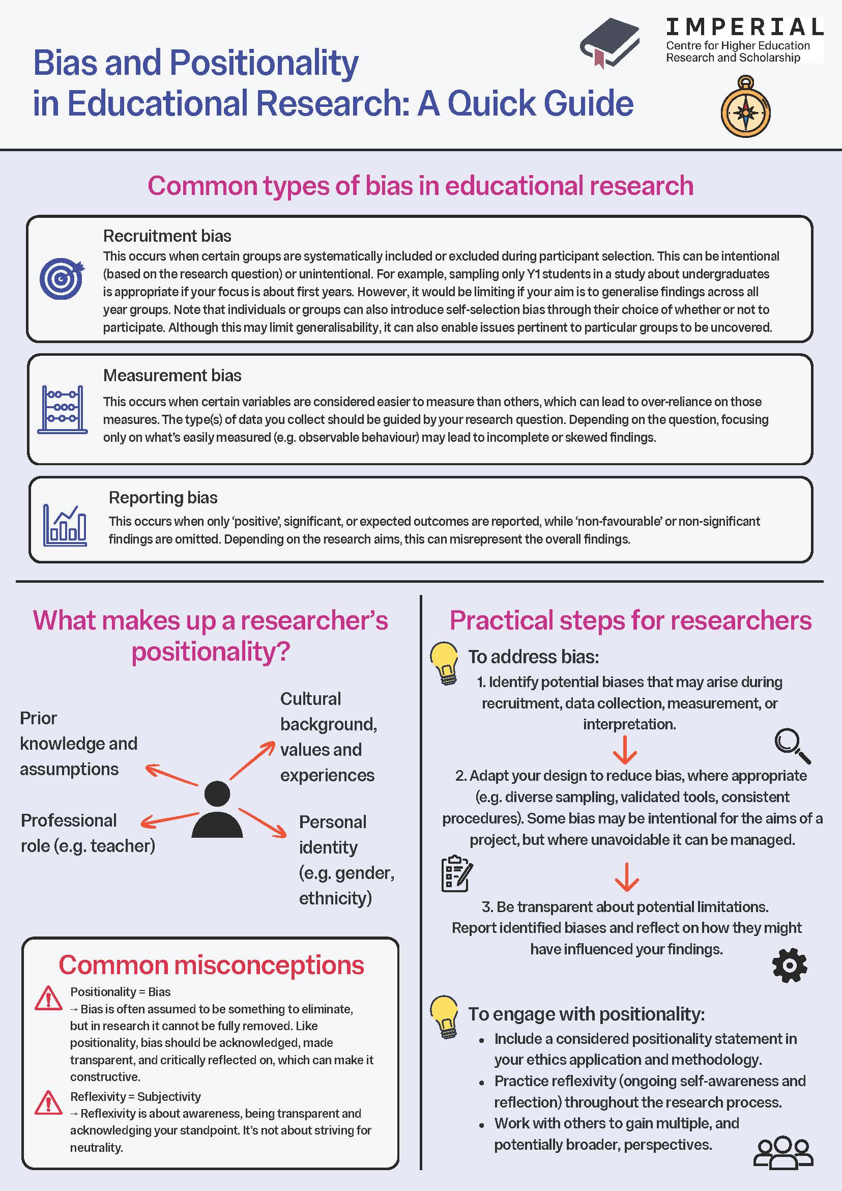 This bias vs positionality infographic provides an overview of common types of bias in educational research, the component parts of a researcher’s positionality, and practical guidance for how to work with bias and positionality in your study.