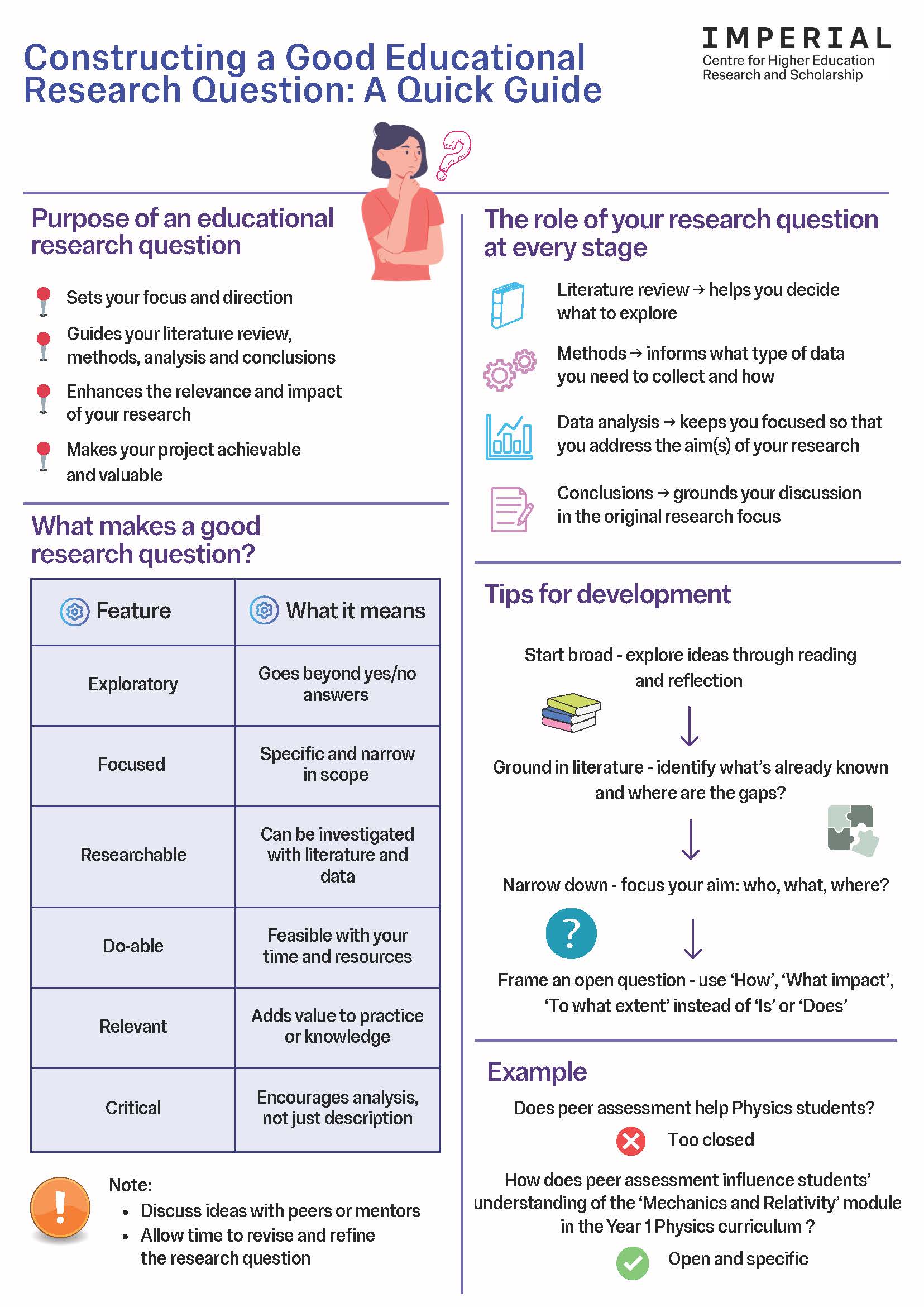This constructing a good educational research question summary infographic provides an overview of how to develop a good research question for an educational research project, with a focus on key features that should be included and practical tips to help you write a clear, focused and achievable question.