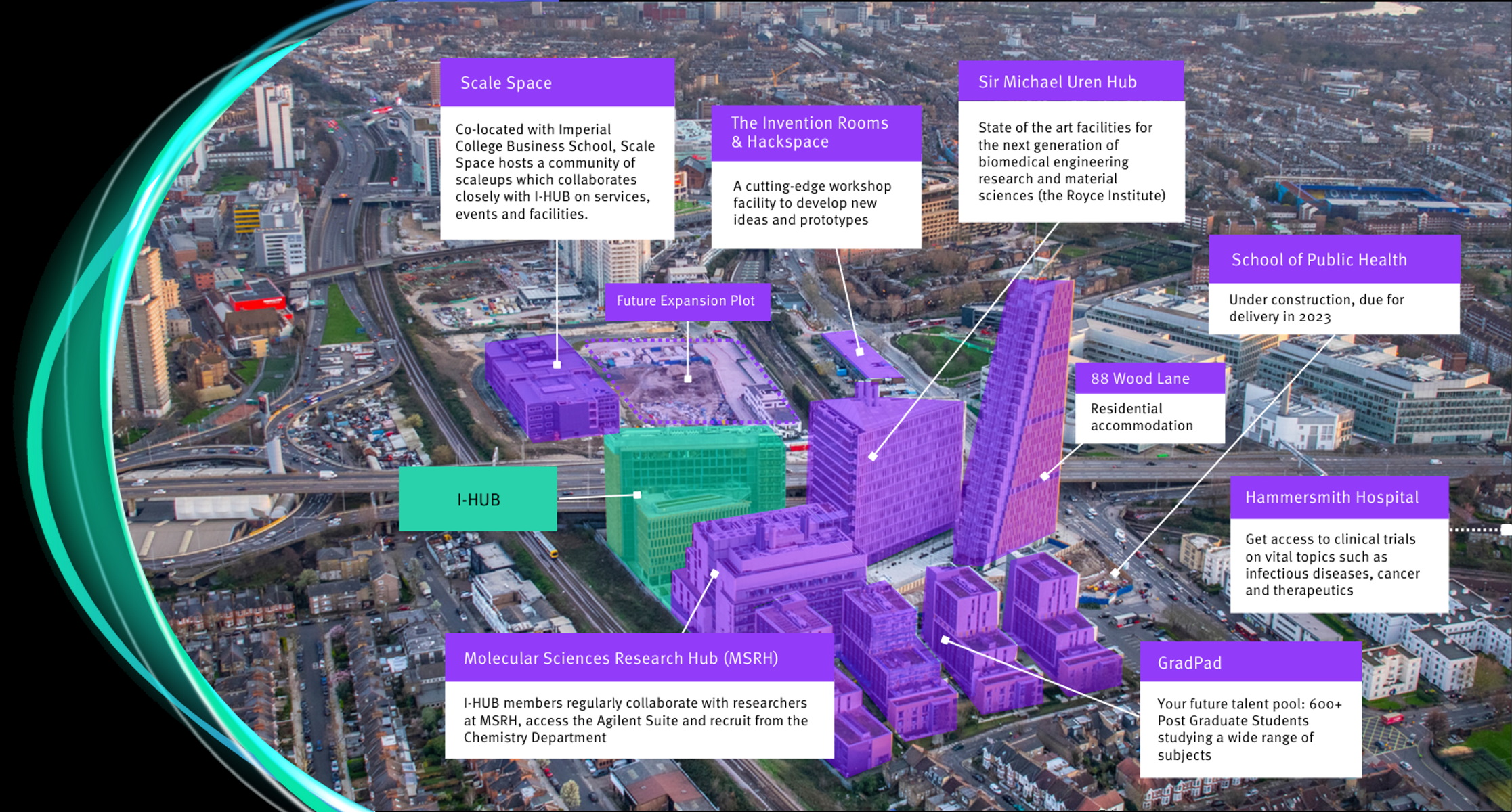 I-HUB is located on Imperial College London’s White City Campus and is at the heart of the White City Innovation District: a unique blend of world-leading researchers, scientists, engineers, entrepreneurs and innovators working together to accelerate discovery and advance society.