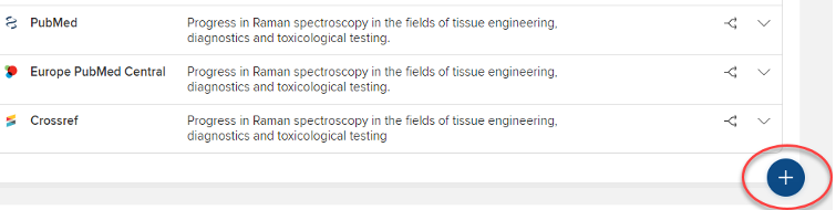 To add a manual record to an existing publication record like WoS, Scopus or PubMed, scrowl down to the end of the publication list and click on the + button