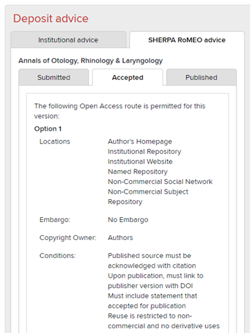 On the repository page in Symplectic you will see the Deposit advice with information about the publisher’s posting policy:
