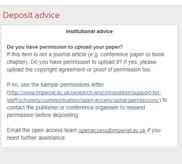 The College expects you to respect prior agreements with publishers and only to self-archive your paper in Spiral where permitted, unless your paper will be published on immediate open access (paid open access). Before uploading a paper, you must check that you have permission.