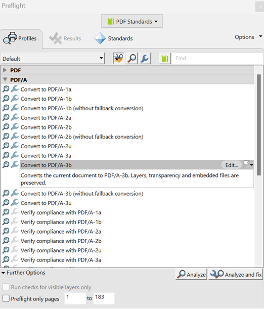 5. Select the option for Convert to PDF/A-3b and then press the Analyze and fix button.