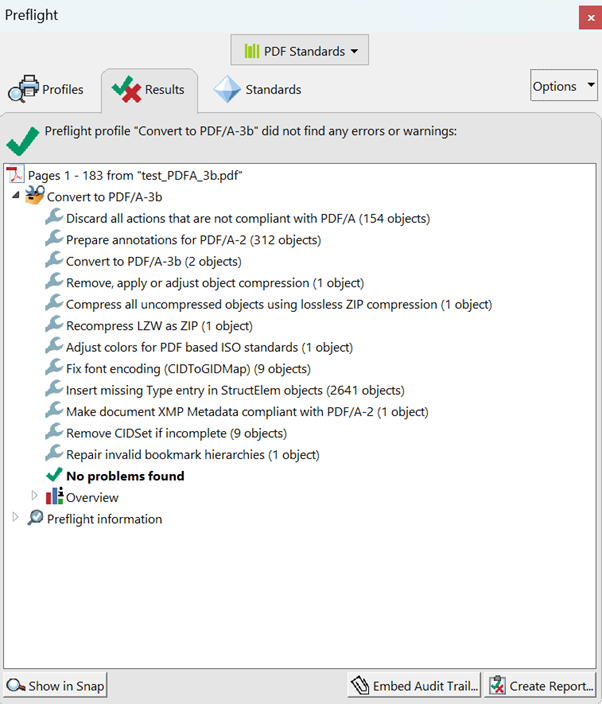 7. Your PDF/A will now be ready for upload if the green tick and No problems found notice is given. If there are any problems found these can be identified by clicking on Show in Snap window (bottom left) and specific issues can be found.