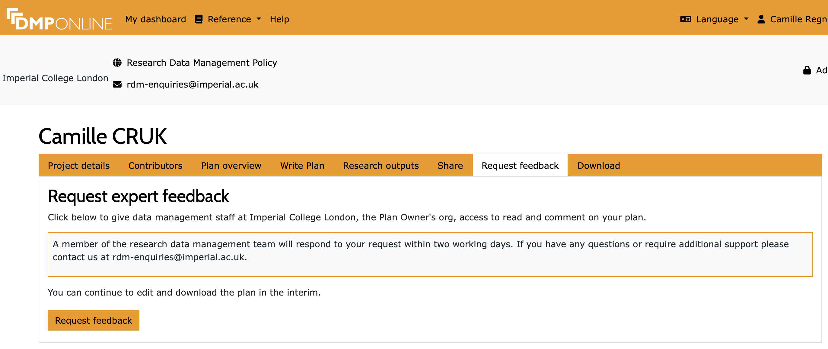 - You can request feedback. This will send a message to the Research Data Management team directly