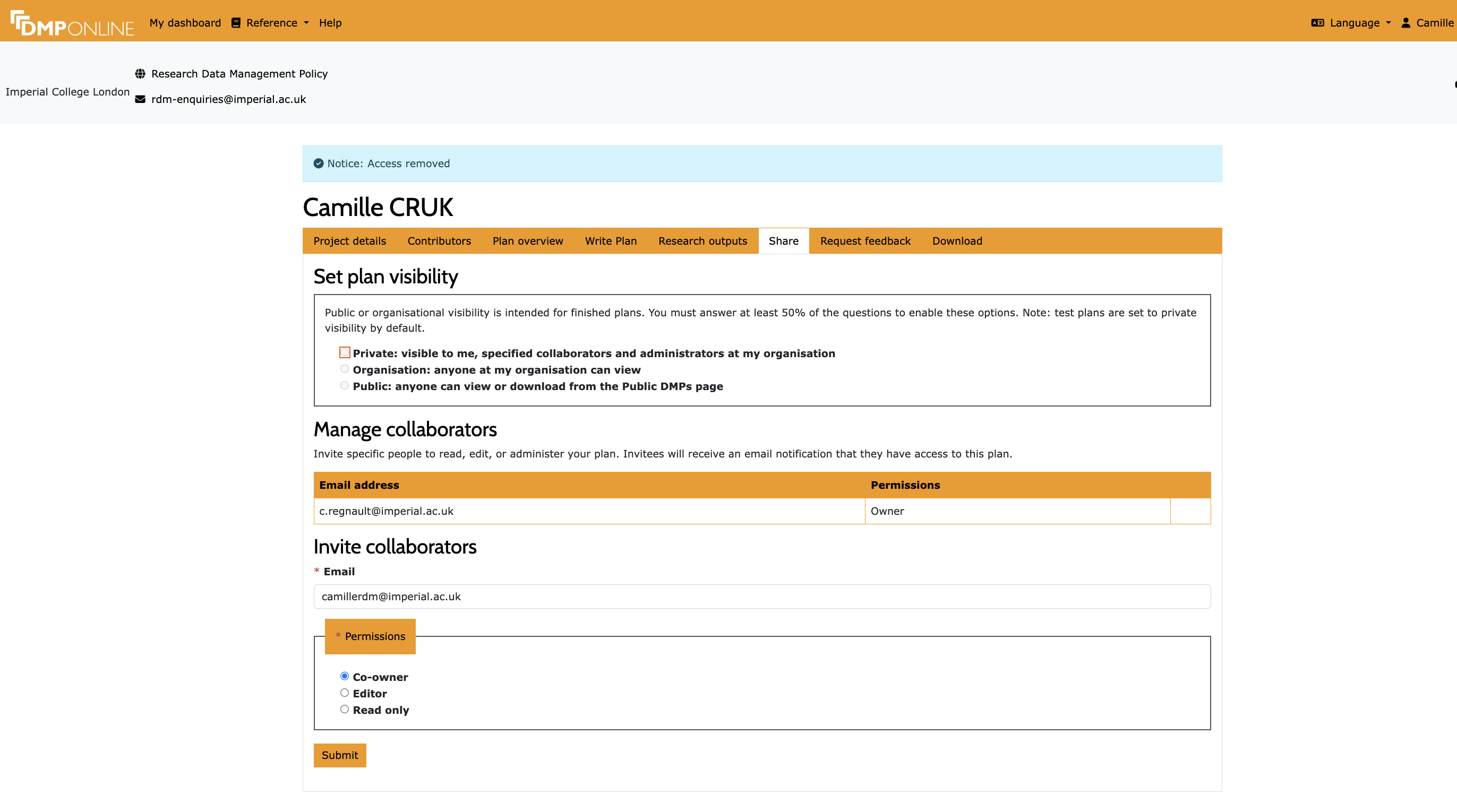 - You can share your plan at any time by selecting the Share tab on the top banner. You can set the privacy level and invite collaborators. To save changes click Submit