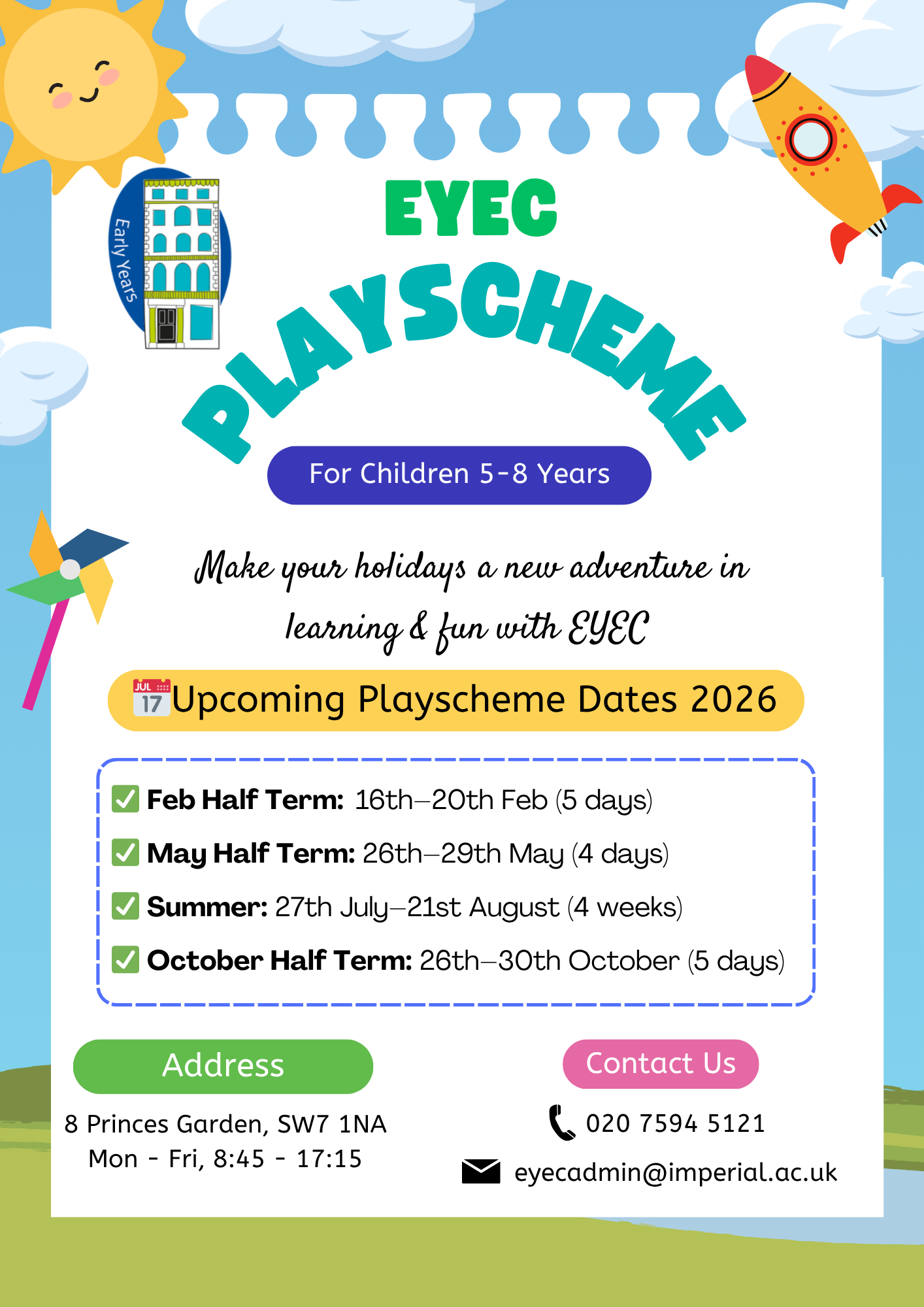 Imperial's very own award winning childcare facility, the EYEC (Early Years Education Centre) run a playscheme during most of the school holidays for children aged 5 to 8 years old.